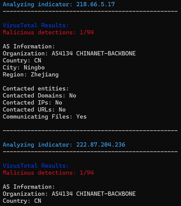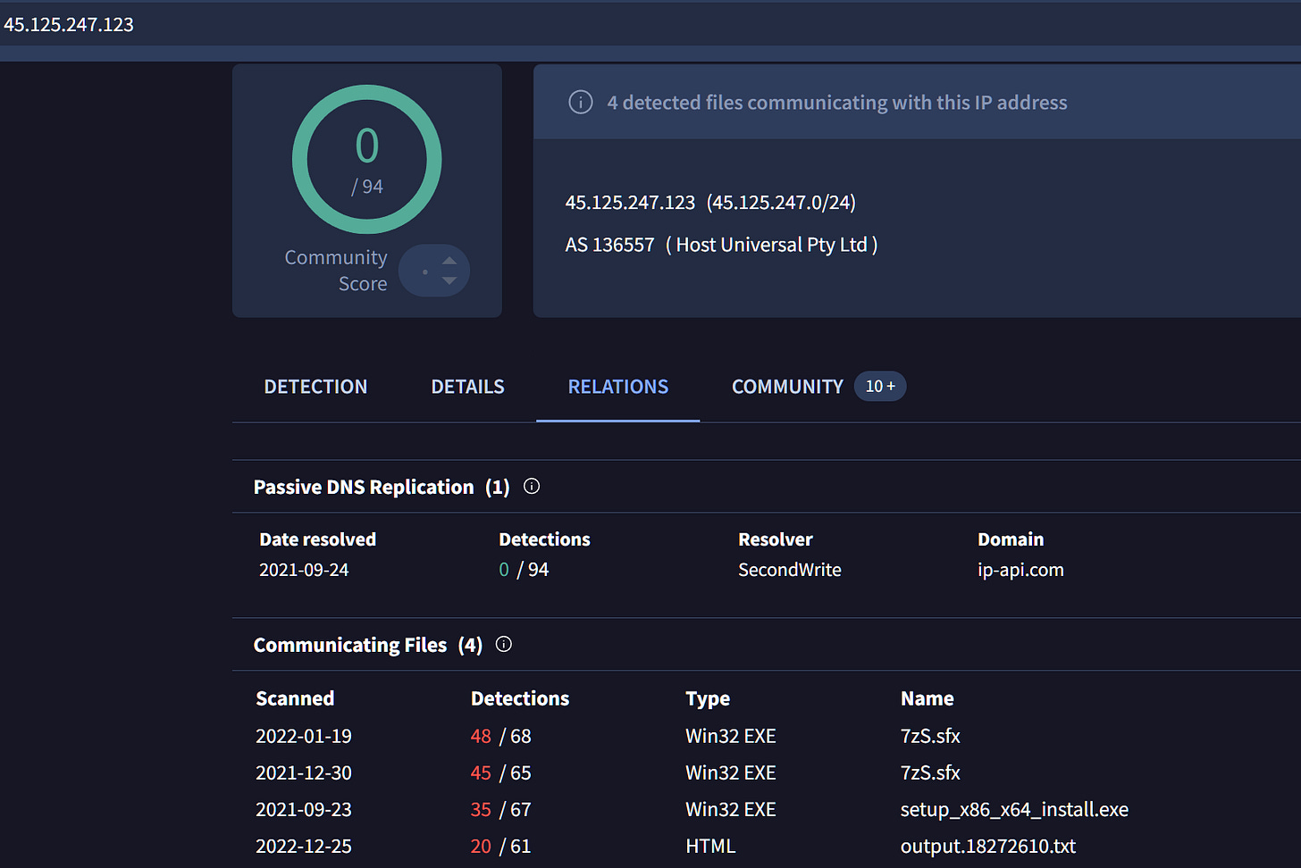 The last of the communicating IPs is part of AS 53334( TUT-AS ) and is associated with AsyncRAT, communicating with more than 488K files so I used the html body which was pointing to geolocation service API to pivot and discovered another server communicating with known malicious files.