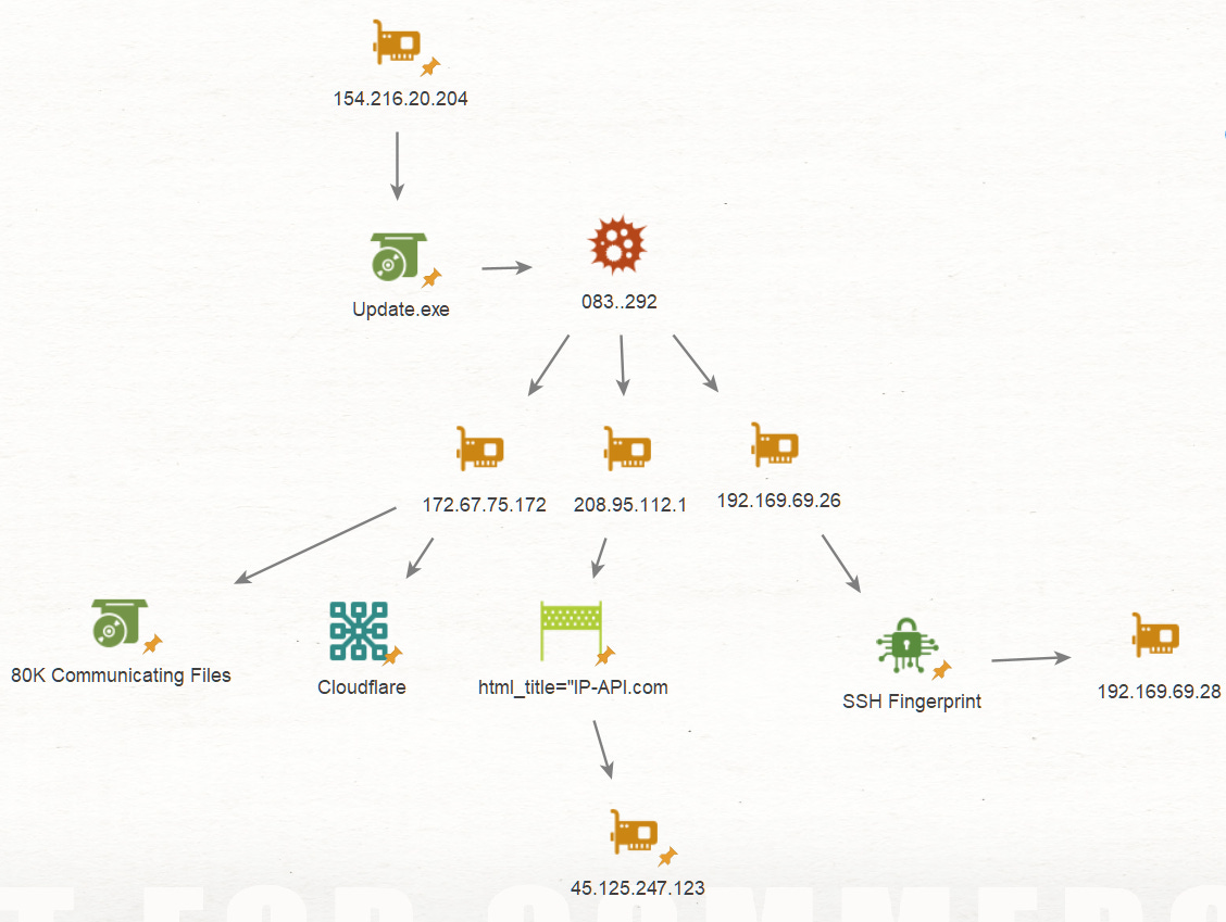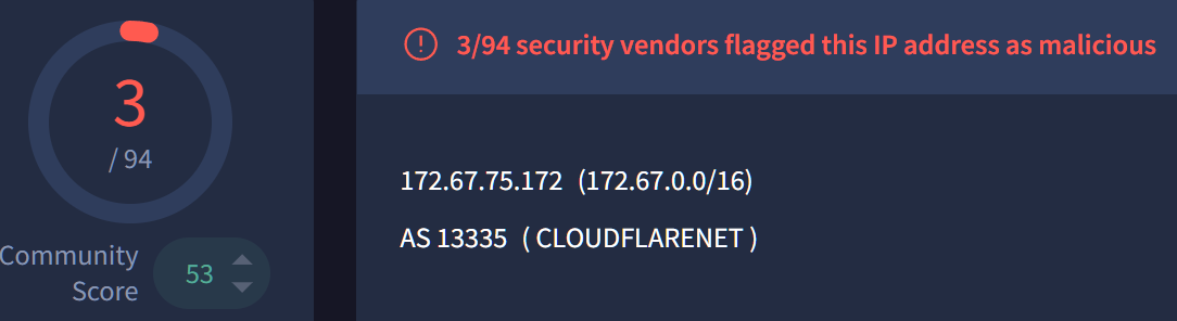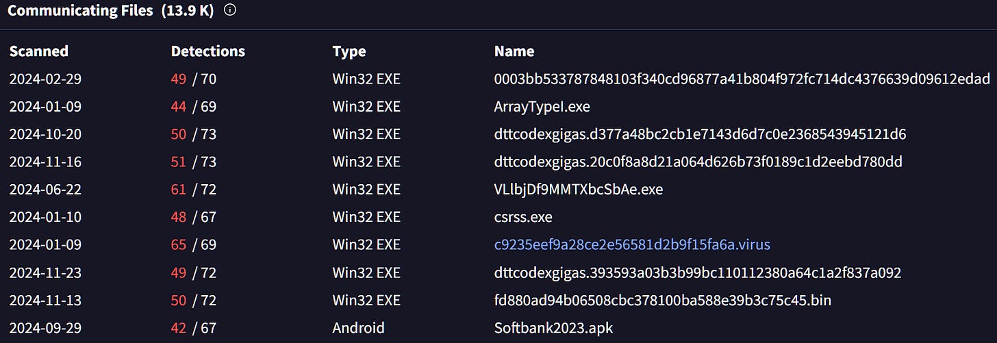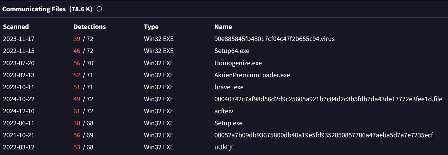 Reviewing the IP which is part of the Cloudflare CDN, we can see that it’s communicating with 78.6K files, most of them reported as malicious leading us to the conclusion that the threat actors behind the malware are using Cloudflare.