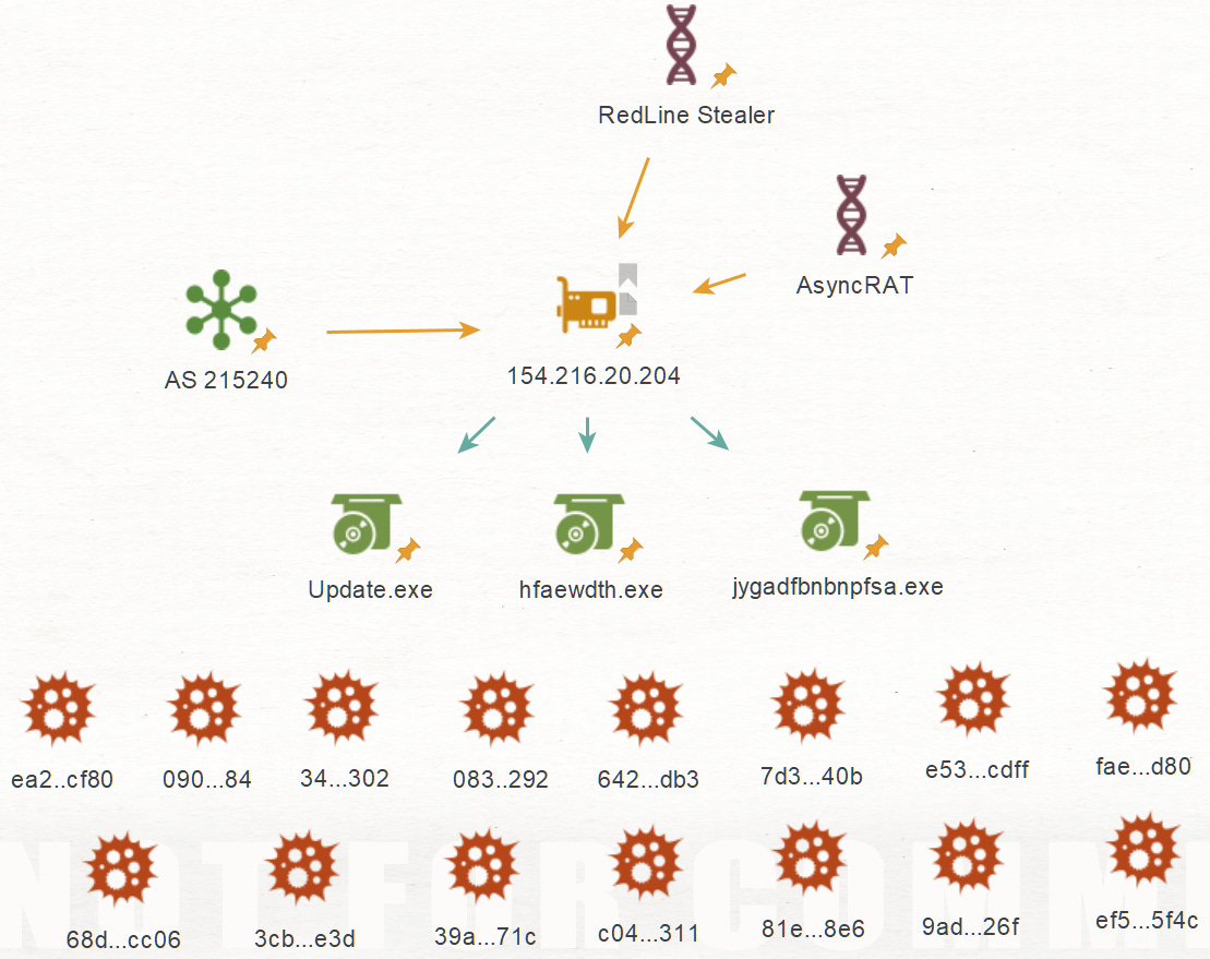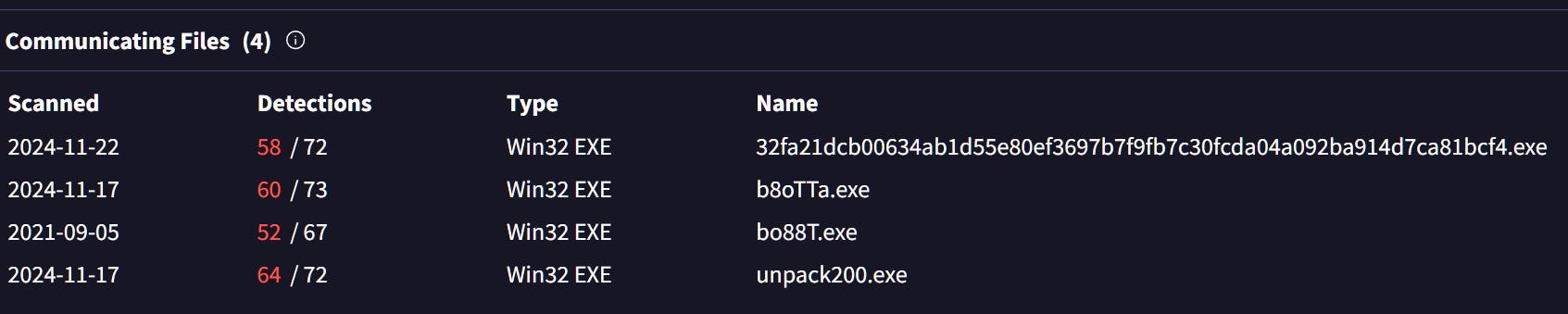 Furthermore the C2 IP 154.216.20[.]204 - AS 215240 is communicating with 15 files which have all been previously reported as malicious, so I reviewed them to map additional infrastructure