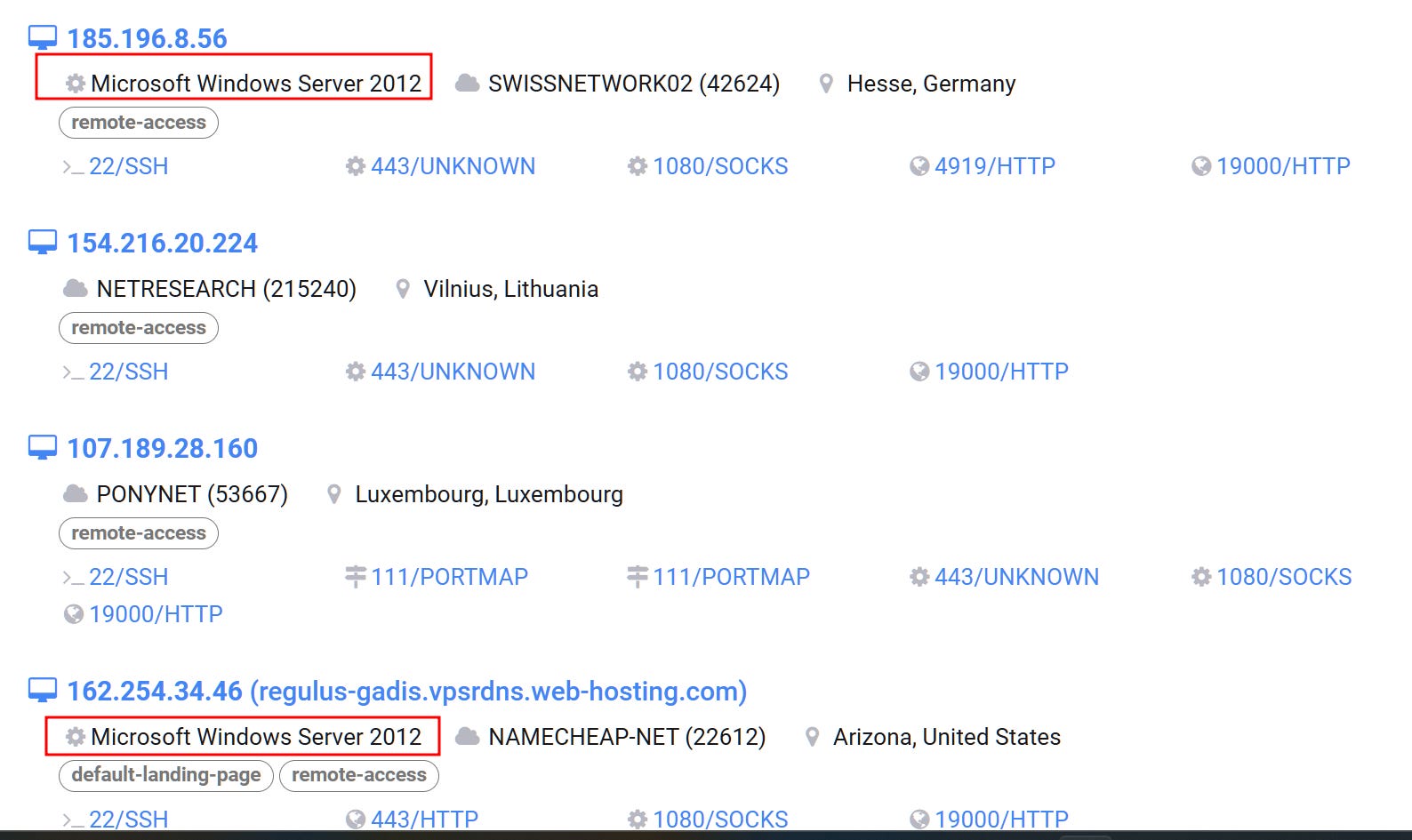 Following the finding of X user Fox_threatintel, we can see that there are 17 hosts matching the query for specific nginx versions running on port 19000. What stands out immediately are the findings regarding Windows server 2012, this was something that helped me identify infrastructure related to Rhadamanthys infostealer on a recent post. This finding helps me hypothesize that this infrastructure is used by multiple threat actors and is mainly serving infostealers and RATs.